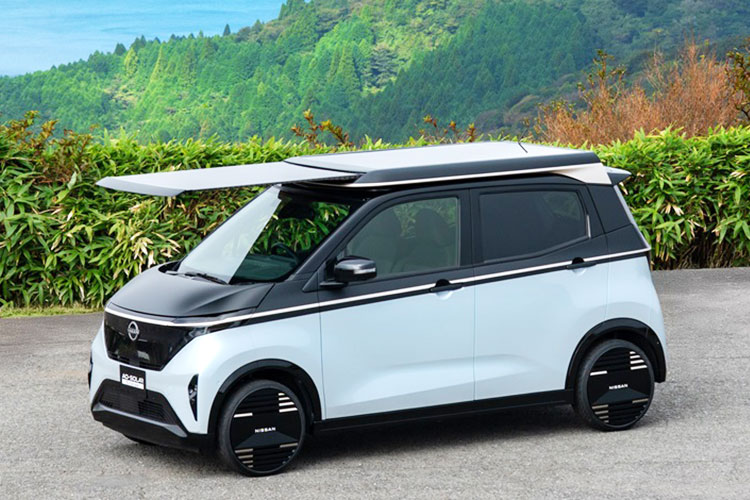 電動スライド式ソーラーシステム搭載の軽EVプロトタイプ。太陽光発電が可能で、自動でバッテリーに充電される。発電能力は拡張時で約500W。災害時の電源としても活用できる。