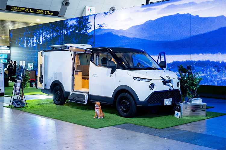 BEVバンをベースにしたキャンピングカー。大型ソーラーパネルを備える。車内空間の広さに加えて、電子レンジや冷蔵庫も利用可能で、上質な大人2人旅を提供する。